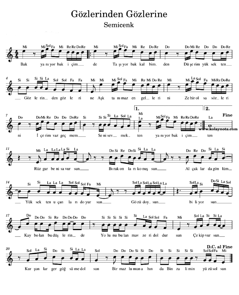 Semicenk - Gözlerinden Gözlerime Keman, Melodika, Flüt, Org, Ud, Bağlama Notaları